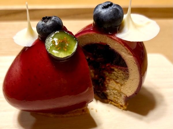 スプーンで盛り付けたような独特な形のケーキは、ブルーベリーの甘酸っぱいコンフィと紅茶のババロワーズのふくよかな香りが、口の中でとろけていきます。しっとりした紅茶のスポンジの層もあり、ケーキに程よい重厚感を感じさせてくれています。
