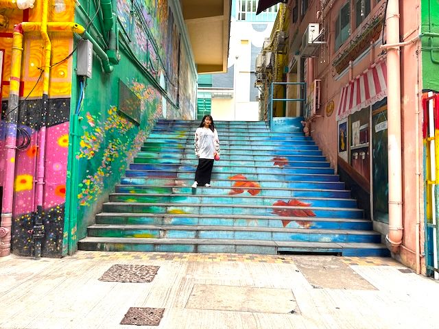 鮮やかな緑色とピンク色の壁に挟まれた階段には、青い背景に赤い金魚が泳ぐ様子が描かれており、ここに立つだけで、まるで水の中を歩いているかのような感覚になるだけでなく、自らもアートの一部になったような気分に。この階段は、多くの人が写真を撮る人気スポットなので訪れた際にはぜひ立ち寄りたい場所の一つです。