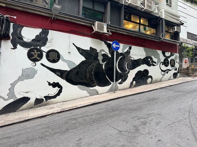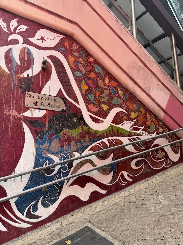 この壁画は、このエリアで一番有名な壁画です。香港の古い集合住宅をカラフルなモチーフにしたこの作品は、Instagramで話題を呼び、今では“香港を象徴する壁画”ともいえる存在に。石畳の坂道、古びた洋館の壁面、そして昔ながらの漢字看板が残る街並みに、現代的なアートが違和感なく溶け込んでいる様子は、まさに“新旧の融合”を感じられます。