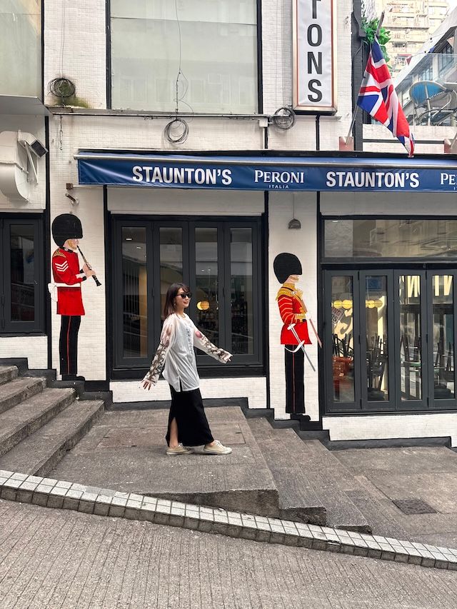 香港のソーホー地区、スタントン・ストリート10-12番地にある「Staunton's Bar & Kitchen」というガストロパブ。この壁画がまるでイギリスに訪れたかのような錯覚をするほど。香港はかつてイギリス領だったこともあり、イギリスの衛兵の姿が自然となじみます。階段になっているので衛兵の1人になったような撮影をすると可愛くまとまります。