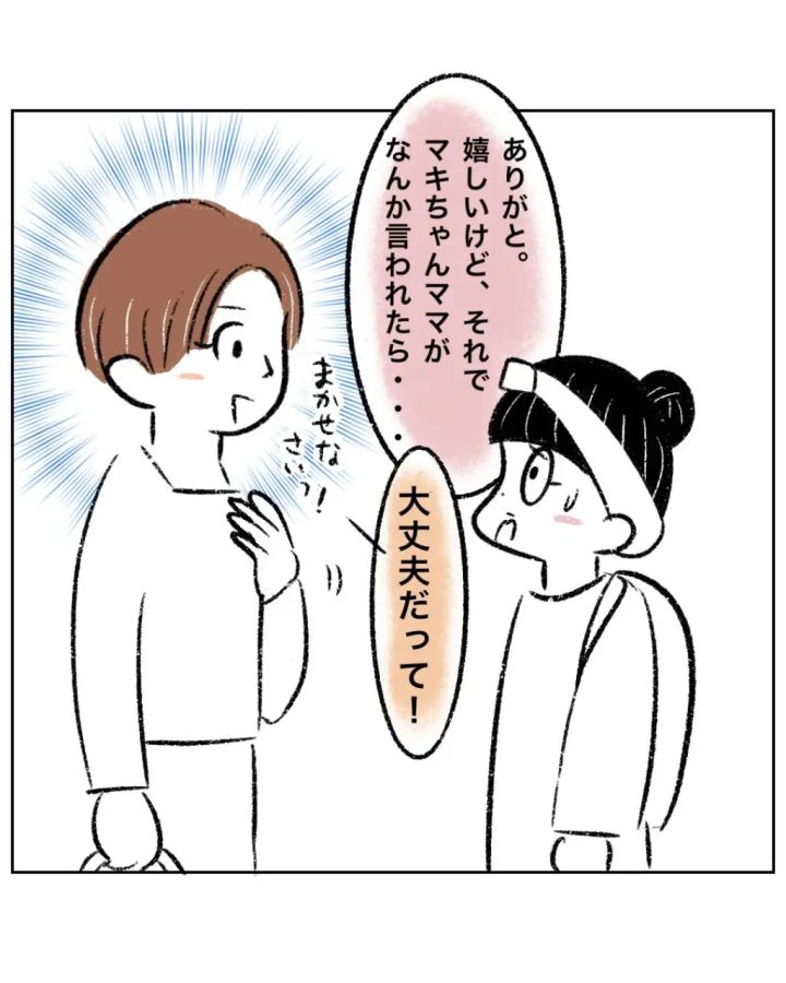 そう言われたまるさんは、「ありがと。嬉しいけど、それでマキちゃんママがなんか言われたら・・」と不安に。でも「大丈夫だって!まかせなさいっ!」と心強い言葉をかけてくれました。