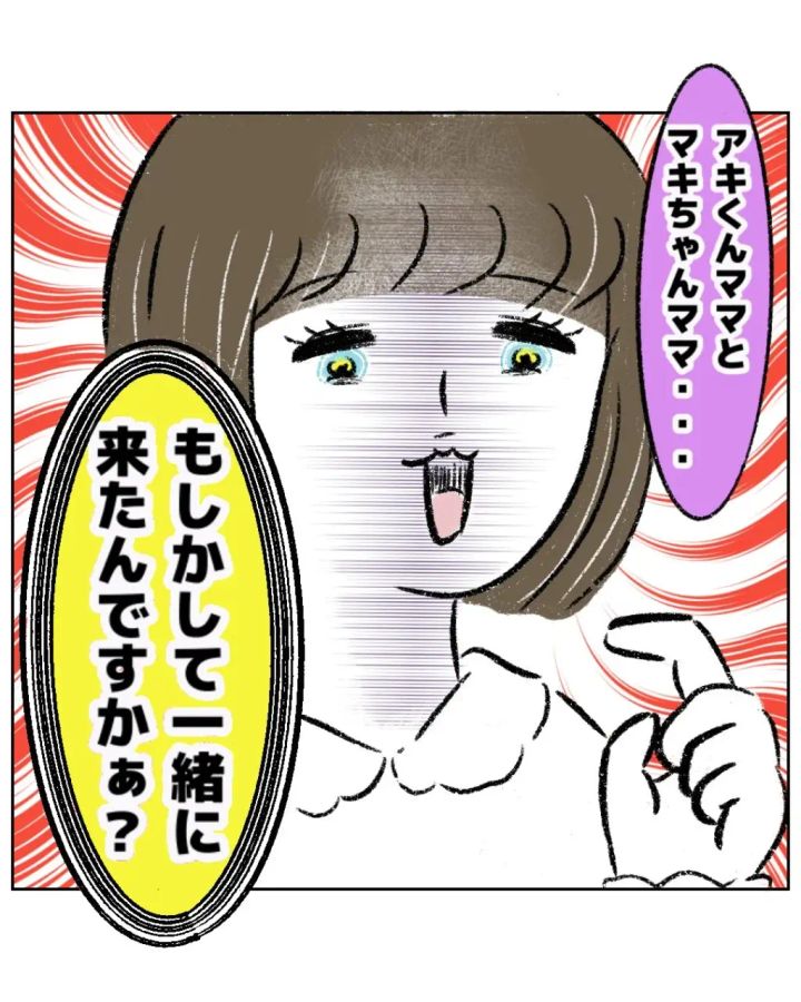 「アキくんママとマキちゃんママ・・もしかして一緒に来たんですかぁ?」かわいらしい口調で言ったものの、ゆかちゃんママの周りからはただならぬ不穏な空気が漂っていました。