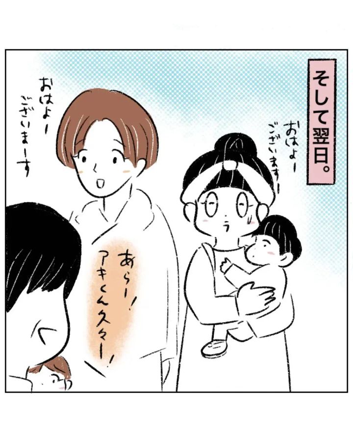 そして翌日。マキちゃんママと一緒に児童館に行ったまるさん。「おはよーございまーす」「あらー!アキくん久々ー」久しぶりに会うアキくんとまるさんに驚いていました。