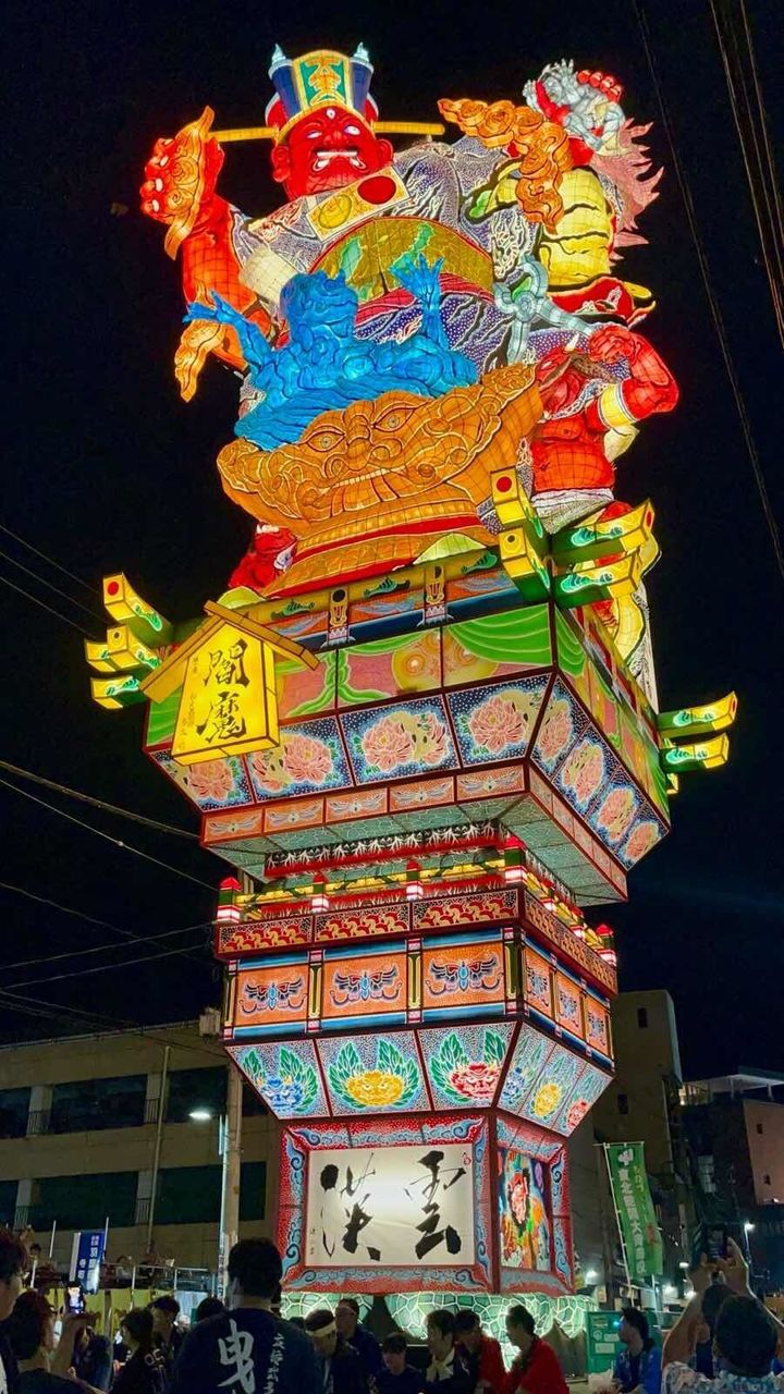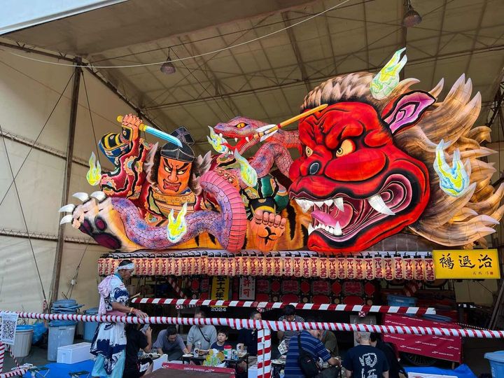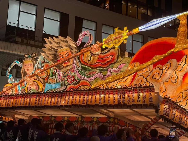 街を練り歩く灯籠(ねぶた)は、武者や神話の名シーンをモチーフにしたものが多く、睨みのきいた表情が魅力です。