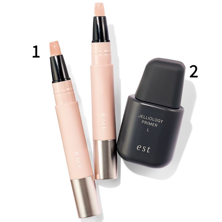 まずは下地で肌にハリを仕込み、キープするところからスタート。もたついて肥大したフェイスラインは濃淡2色のリキッドコンシーラーで陰影を作ってスッキリとカモフラ。