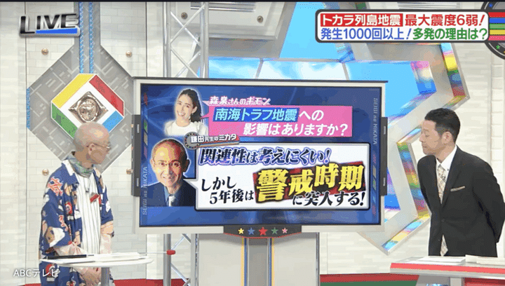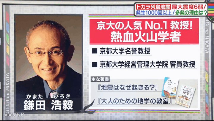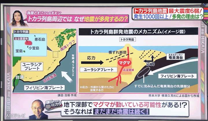京都大学名誉教授の鎌田氏によると、「トカラ列島は、4年前から群発地震が起きている場所だが、今回の震源は今までになかった現象ではある」と言いつつも、群発地震は頻繁に発生するため、他で発生する地震と偶然重なる。数年前から発生している地震であるため、法則ではなく「どこでもありうる。だから関係ない。というのが科学的根拠」と解説。