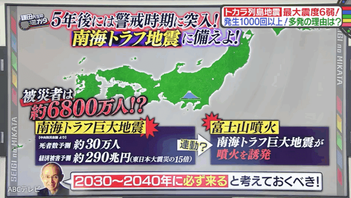 鎌田氏によると、「5年後には警戒時期に突入すると推測される南海トラフ地震は、宮崎から静岡にかけて約800Kmが震源域と極めて広域。震源地はバラバラで、それが一挙に起こるため、トカラ列島群発地震の100万倍のエネルギーが発生する」という。