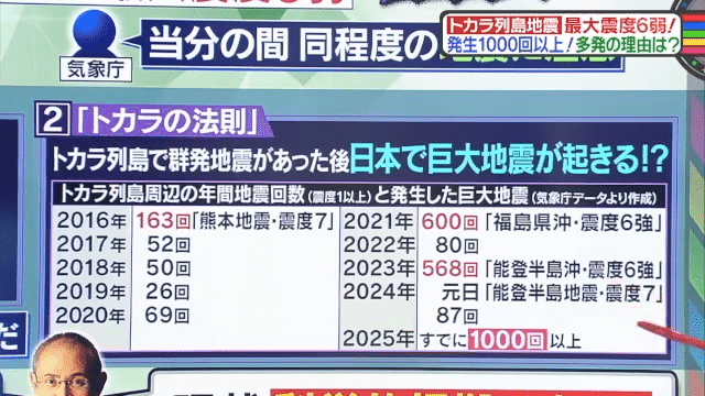 一方、鹿児島トカラ列島近海では、先月21日以降地震が多発。 1995年以降で過去最多を記録し、7月3日には悪石島で震度6弱を観測している。その3時間前には、鹿児島県・下岳の噴火が発生していたことから、「トカラの法則」という俗説がまたもやSNS上に流布。この内容に関しても、気象庁は科学的ではないと否定している。
