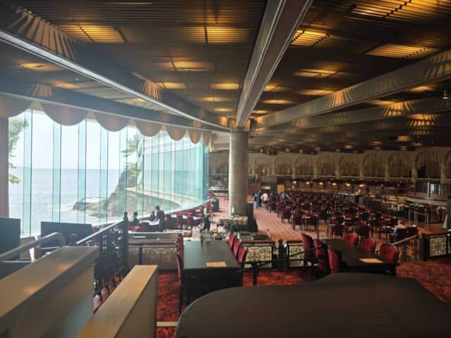 まるで劇場を思わせる上質で巨大なレストラン。驚くことにほとんど創業当時のままの内装なのだとか。目の前に広がる海を眺めながらの食事も特別感いっぱい。こういう片方が明るい空間を撮影するときは、明暗のコントラストが激しすぎて、室内が真っ暗になったり、外が白く飛んだりして写りがち。そんなときはスマホ画面の室内側をタッチすれば簡単に明るさを補正。海も素敵なレストランも、両方見える写真が撮れました。