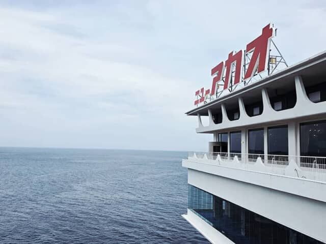 まずはレトロブームで人気の「ニューアカオ」。眺望抜群の露天風呂や、ランチは日帰りでも楽しめて、熱海駅からは送迎もあるので電車旅にもオススメ。有名なホテルのロゴを海と一緒に撮れるオーシャン・ウイングの17階テラス。撮影した写真は、画像の加工を楽しめるフィルターの中から「シバー」を使い、ちょっとクールに雰囲気を変えてみました。