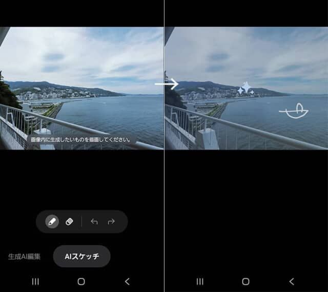 何もない広い海の上に、「AIスケッチ」を使って船を浮かべることも可能。画面に簡単なイラストを描くと……