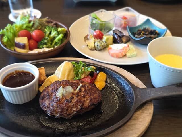 ダイニングでは和洋5種類からメイン料理を選べるハーフビュッフェをいただけます。選んだのは「ニューアカオ特製ハンバーグ」。肉の旨味もたっぷりで、肉汁が口の中であふれます。料理を撮影するときは「食事モード」に設定を変更。まわりの背景をぼかしてくれるので、料理がよりひきたちます。
