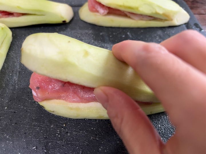 切り込みを入れすぎると、豚肉とチーズを挟むときになすが切れてしまうので、注意してください。