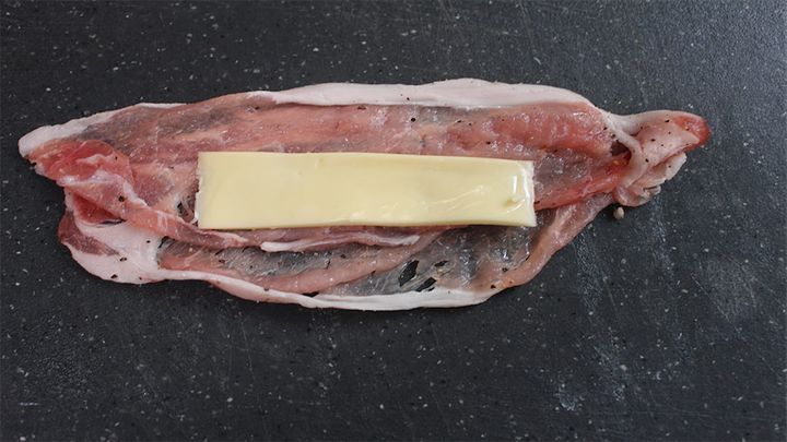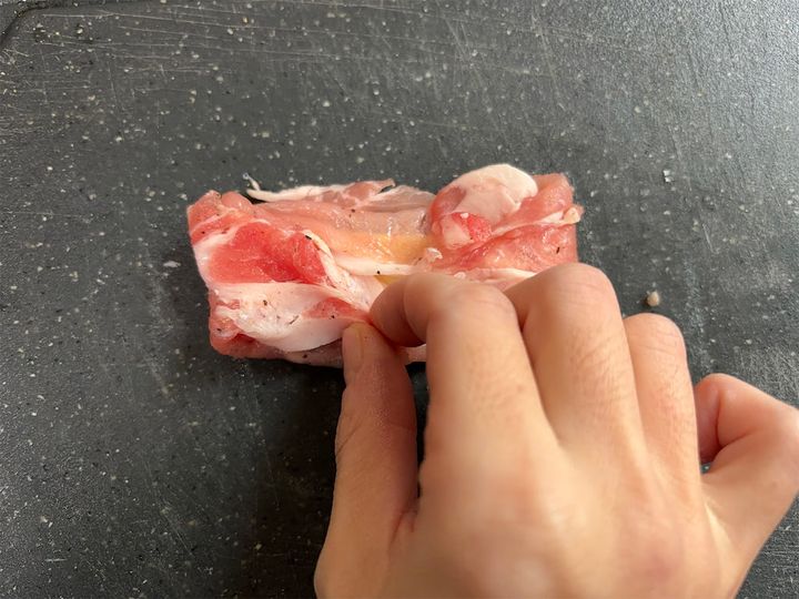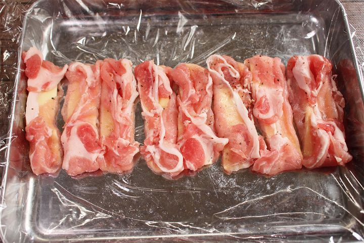 5.豚肉1枚にチーズ1枚をのせて包みます。8個同じように作りましょう。