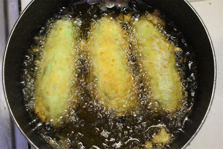 揚げる時にチーズが溶け出さないよう、全体をしっかり抑えましょう。