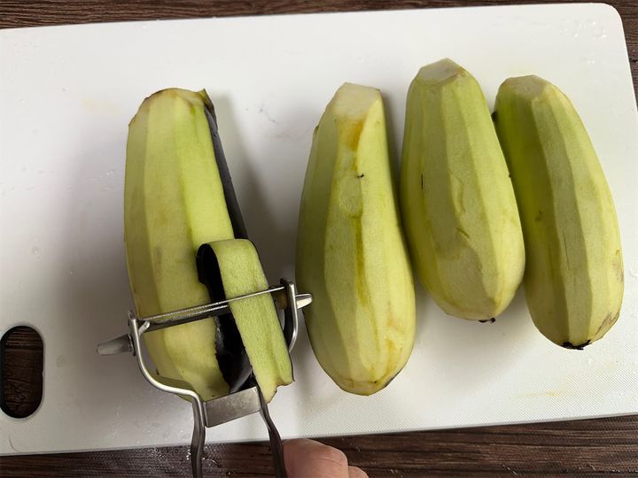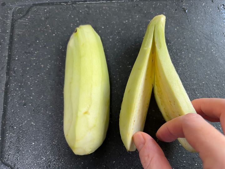 1.なすはヘタを取って皮を剥き、縦半分に切ります。