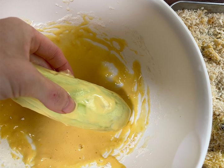 全体にまんべんなく絡むようにしましょう。ここでしっかり衣を全体につけないと、パン粉がつきにくくなってしまいます。