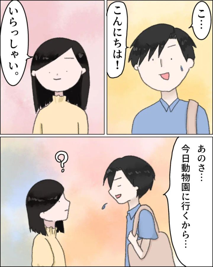そして、約束通り1週間後、カズヒデは実家に家族に会いにやってきました。その日は動物園に行くことになっており、リコも家族で動物園に行けることをとても楽しみにしていました。「こ・・・こんにちは!」と挨拶するカズヒデに私は「いらっしゃい」と返事をしました。すると急に照れくさそうに「あのさ・・・今日動物園行くから・・・」と話し始め・・・
