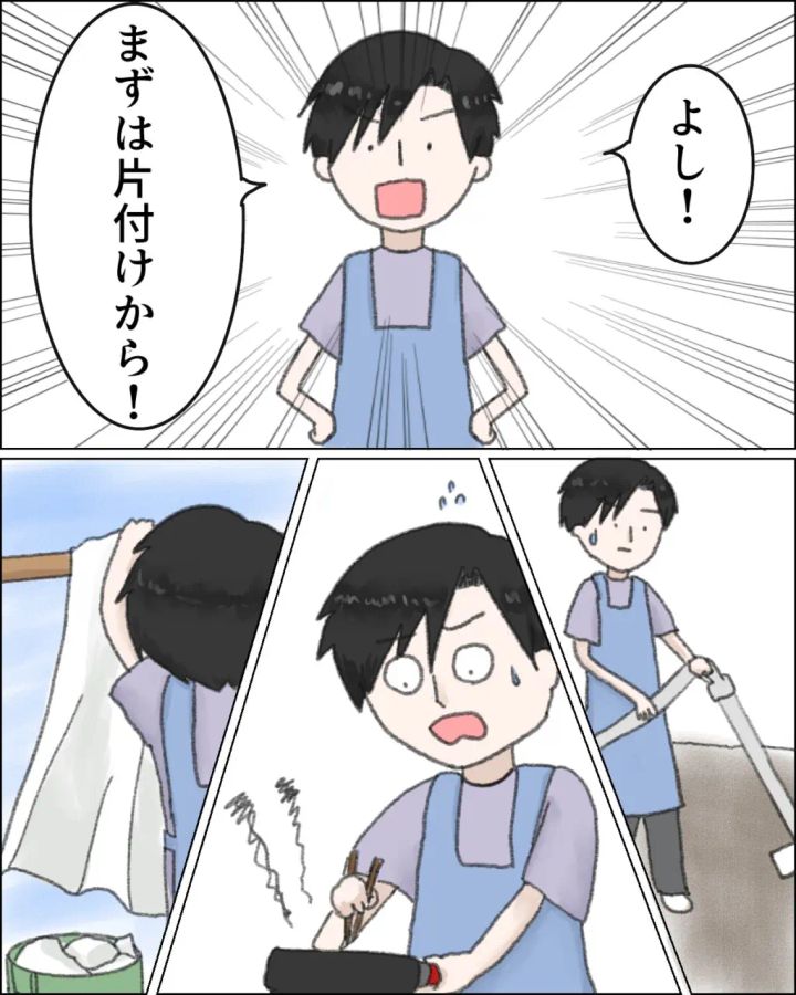また家族一緒に暮らせるチャンスが残っているかとの問いに「あなた次第」と答えた私。でも内心は人はそう変われないし、カズヒデをまた信頼できる未来に期待などしていませんでした。ひとりで帰宅したカズヒデは、「よし!まずは片付けから!」苦戦しながらも慣れない掃除や料理に挑戦し始めたのです。