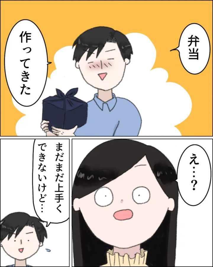 「弁当作ってきた」とカバンの中から取り出しました。私は、予想外なカズヒデの行動に「え・・・?」と目を丸くして言うとカズヒデは「まだまだ上手くできないけど・・・」と照れたように言いました。