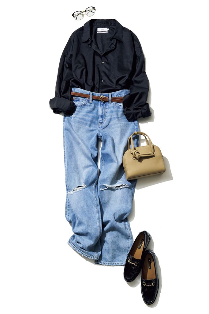 黒シャツは着まわし。ダメージデニムパンツ円/Gap 眼鏡/Ray-Ban(ルックスオティカジャパン カスタマーサービス) ベルト/TORY LEATHER(メイデン・カンパニー) バッグ 48,400円/VASIC(ヴァジックジャパン) ローファー 29,700円/ダイアナ(ダイアナ 銀座本店)