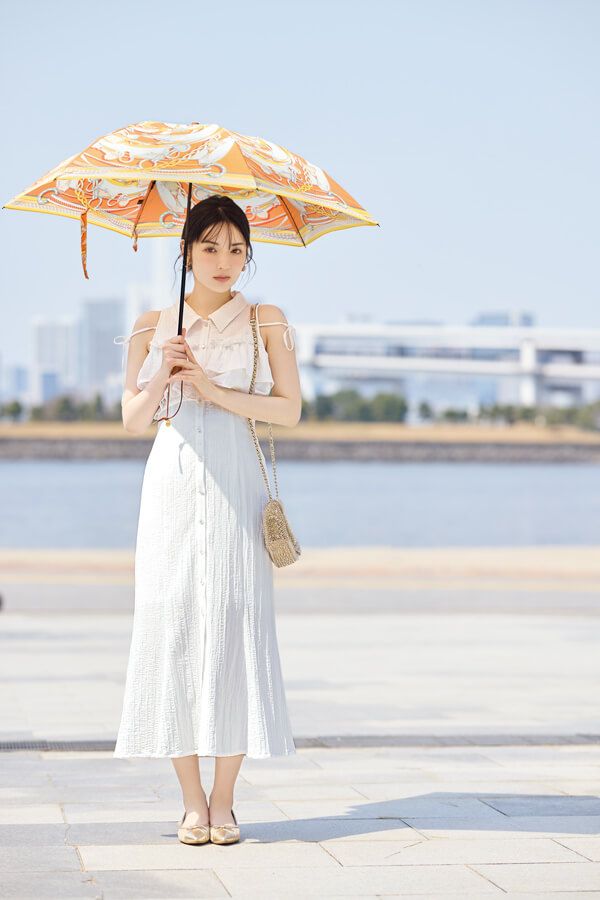 猛暑が続く日本の夏は、もはや日傘なしでは乗り切れない! 毎日使う必需品だからこそ、ルックスにも機能性にもこだわりたいところ。シンプルな夏の白ワンピコーデには、今年らしいスカーフ柄の日傘がマッチ♡ 夏の日差しに映えながらUVカットも叶えられます♡
