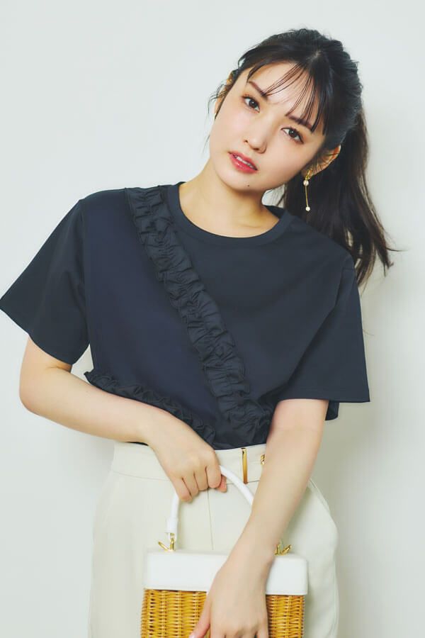 辛口になりがちな黒Tには甘さをON♡斜めフリルでおしゃれな印象にブラッシュアップ!