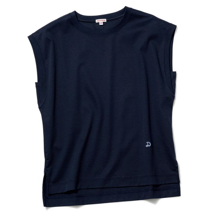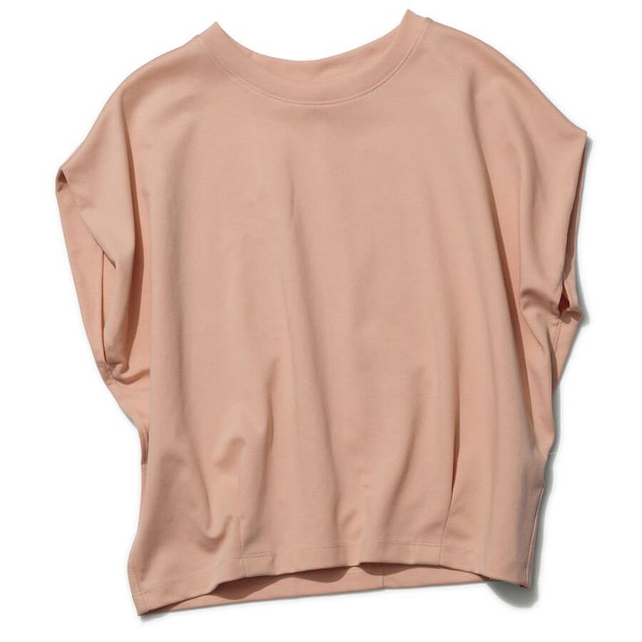 肩まわりのしっかりとしたフレーム感を隠しながら、ノースリのスッキリ感を楽しめるフレンチスリーブが頼れます。