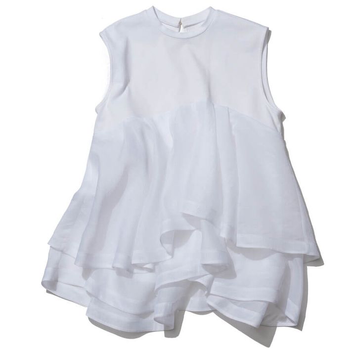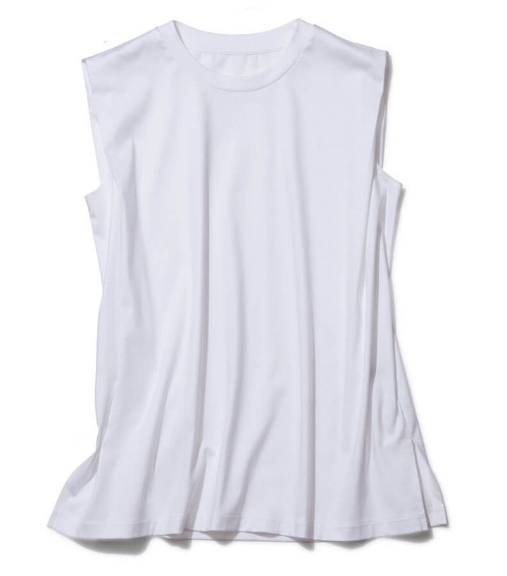 ブラウジングでゆとりを出し、フレーム感が目立つ骨格をカバー。シンプルかつノースリで抜け感を出せる1枚。