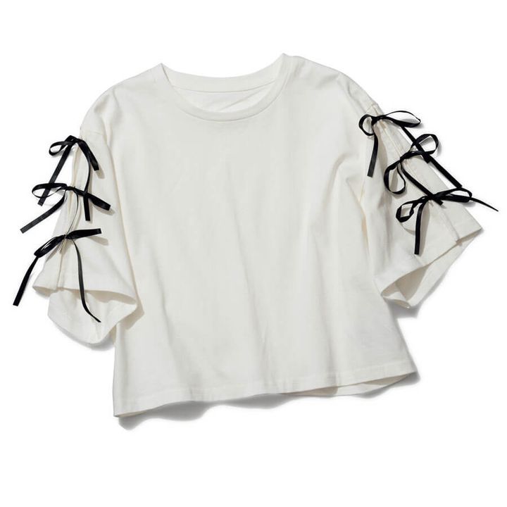 左右の袖に3つずつリボンを連ねた甘デザインは、ナチュラルな生地感を選ぶのが似合わせのコツ。リラックス感あるゆったりシルエットも、買うべき条件に一致します。