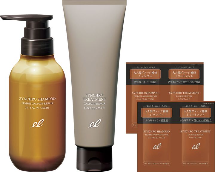 頭皮と毛髪を 同時にケアする浸透泡がやみつきに♡エレクトロン シンクロシャンプー ファム ダメージリペア シンクロトリートメント ダメージリペアセットでパウチ2包ずつが本誌の付録に。