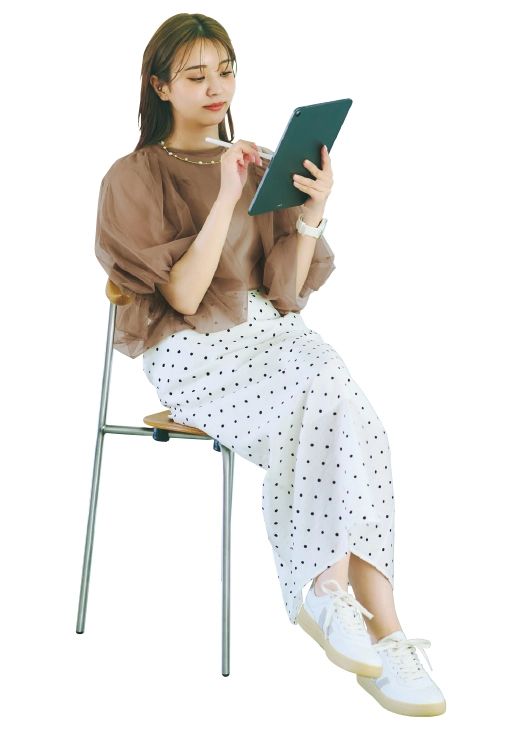 ON/OFFの切り替えをしっかりしたいからリモートでも手抜きに見えないコーデをするのがマイルール!1枚で映える万能トップスにドット柄で普段よりは糖度高めのコーデに。白のスニーカーならきれいめコーデにも馴染みます。