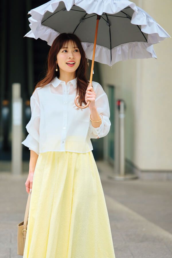 トップスをインするだけで蒸し暑さが増す時期。軽やか素材のきれい色フレアスカートにはシアーシャツをふんわり合わせて涼しさを優先。だらしなく見えない短め丈ならオフィスでもセーフ。長時間直射日光に当たると危険な暑さなので、日傘を忘れないようにしましょう。
