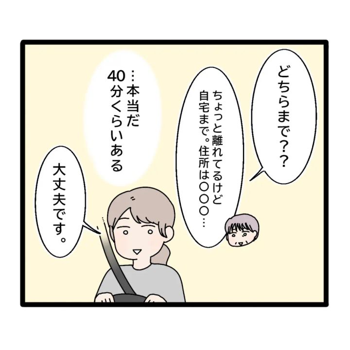 女性に「どちらまで??」と聞くと「ちょっと離れてるけど自宅まで。住所は・・・」と話し始めました。確かに少し遠い場所で片道40分くらいありました。私は「大丈夫です」と返事をし、車を出発させました。