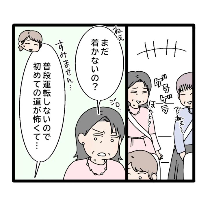後部座席で楽しそうな義母と義母の友人。初めていく道に少し迷ってしまい、到着時間が少し遅れた頃・・・義母が急に「ねぇ、まだ着かないの?」と聞いてきました。私は「すみません・・・普段運転しないので初めての道が怖くて・・・」と言いました。まるで運転手扱い。