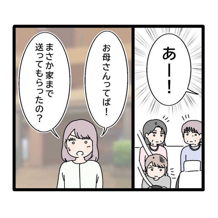 すると外から「あー!」と大きな声が。外を見てみると、私くらいの女性が「お母さんってば!まさか家まで送ってもらったの?」と車に寄ってきました。