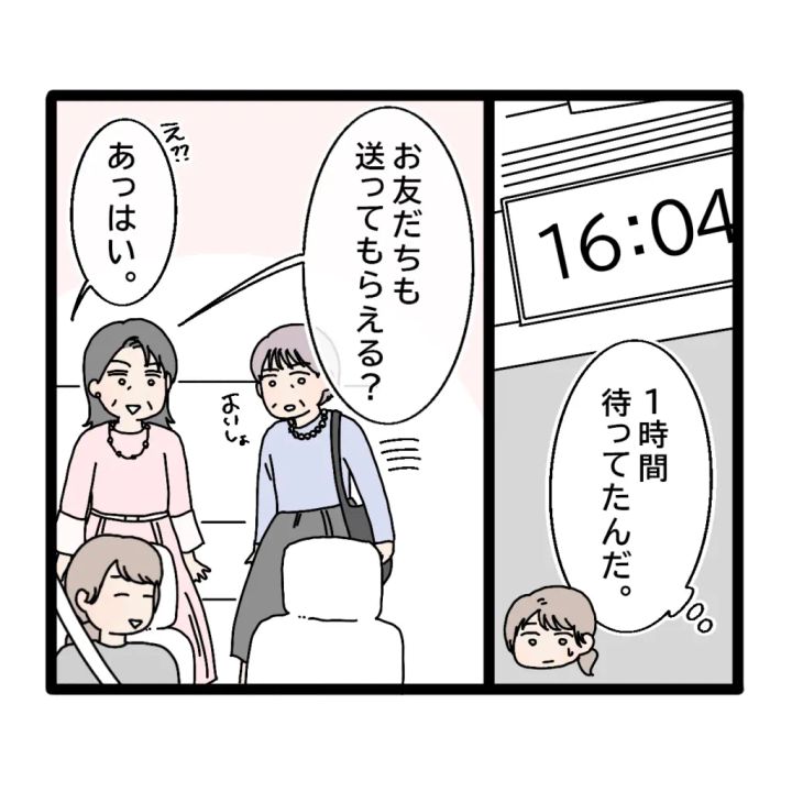 義母に言われた15時に間に合うようにお迎えに来た私ですが、「はーい」とメッセージをもらってからなかなか義母は来ません。駐車場で待っているうちについウトウトしていたようで、義母がコンコンと窓を叩く音でハッと目が覚めました。時計を見ると約束の時間から1時間以上経っています。あと1時間もあったなら映画だってギリギリ観に行けたかも。そんな私を気遣うはずもない義母が乗った後、続けてもう1人、知らない女性が車に乗ってきました。義母が「友だちも送ってもらえる?」と言うので私は「あっはい」と返事をするしかありませんでした。