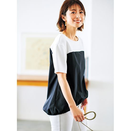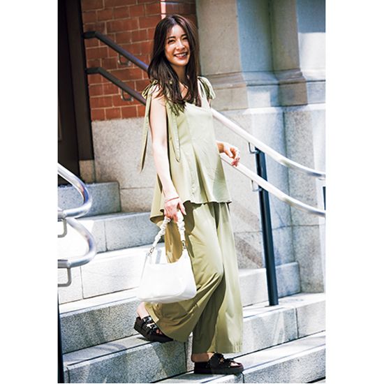 ドッキングカットソー¥11,990(I.T.’S. international)パンツ¥9,000(アテニア)バッグ¥10,450サンダル¥15,950(ともにダイアナ/ダイアナ 銀座本店)時計¥20,900(マトウ/エイチエムエスウォッチストア 表参道)バングル¥55,000ピアス¥68,200〈ともにミチウィルウェイ〉リング¥23,100〈フィリアム〉(すべてフォーティーン ショールーム)