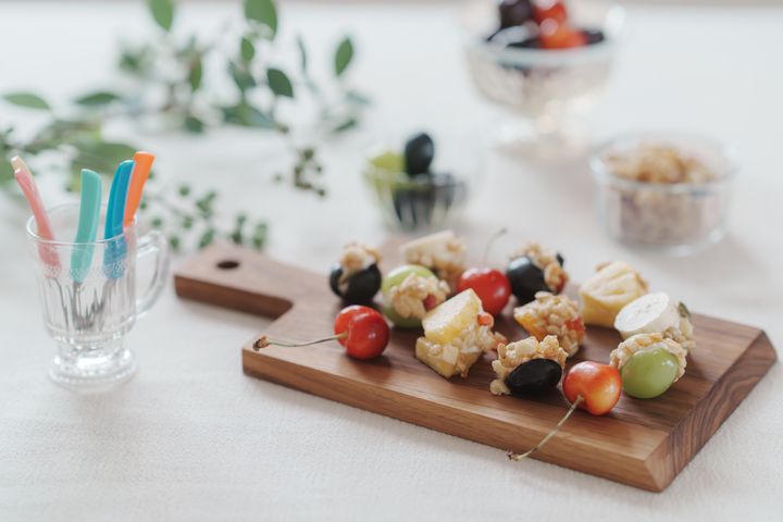 ※クリームチーズをはさんだ後、ピックなどにフルーツを刺すと、フルグラ®をつけやすくなります。