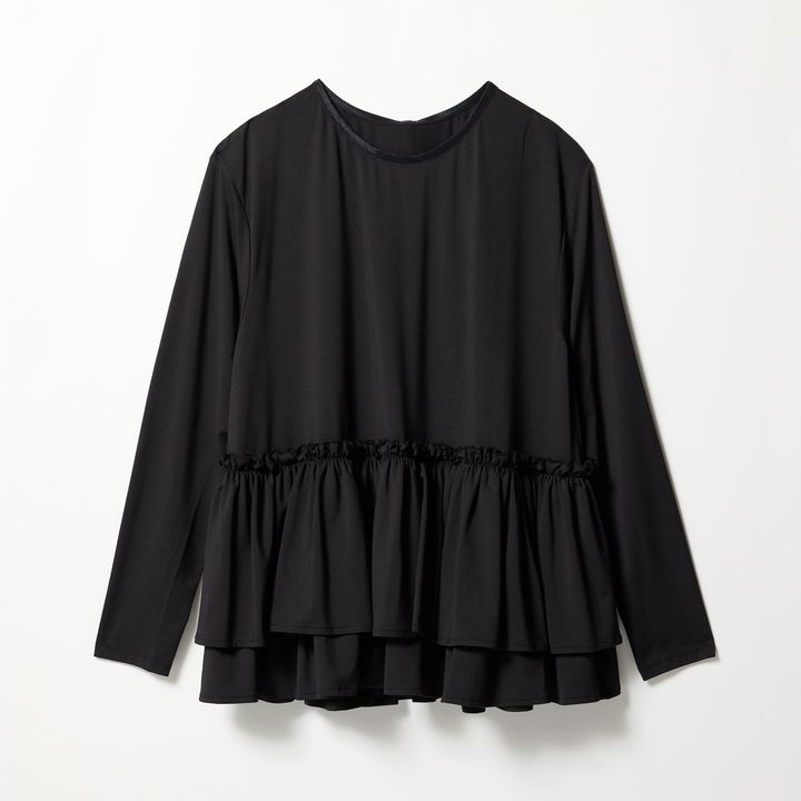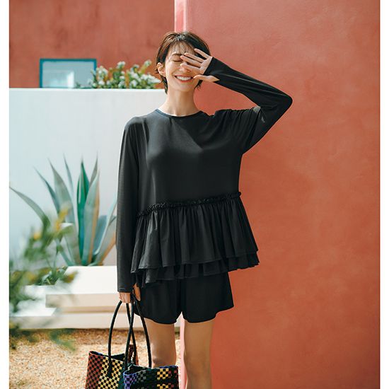 立体感のある2段フリルのペプラムは、ラッシュガードならではの素材で落ち感があるので大人っぽく着られます。オールブラックのワントーンコーデにゴールド小物をプラスして、洗練された印象にすればちょっとしたお出かけにも◎。お尻が隠れる丈なので、腰回りの気になるタイトなボトムとも合わせやすく、スタイルアップ効果も抜群。