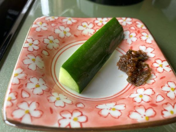 箸休めの香の物。新鮮キュウリに味噌をつけていただきます。