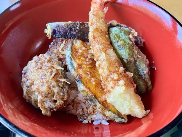 大きな美しい器は「天丼」。 大きな海老のおいしさは言うまでもなく。そして七ツ森名物の肉厚シイタケ、大きなカボチャ、ピーマンやサツマイモ。ほおばるたび口の中に新鮮野菜のおいしさが広がります。