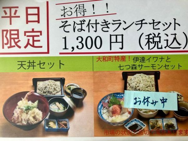 売り切れ御免!平日限定手打ちそばと天丼のセットがお得な1300円「里山Dining七ツ母里」【大和町】