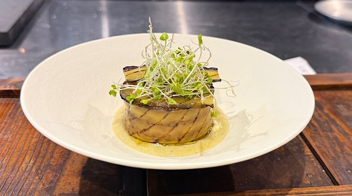 茄子のピューレが敷かれた夏野菜の詰め物の茄子の中には、