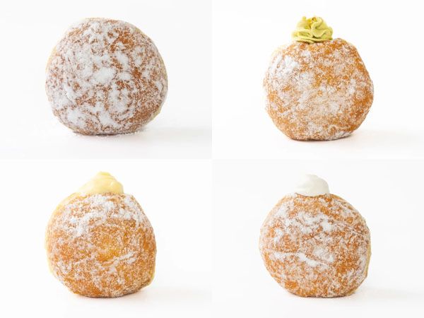 (左上から時計回りに)生マラサダ、生マラサダ ピスタチオ、生マラサダ 練乳ミルク、生マラサダ カスタード