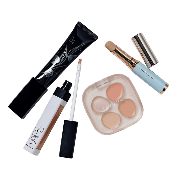 右から:ブライトアップ ファンデーション SPF33・PA+++ B1 ¥3,850(カバーマーク)、 ペタル フロート フローレス タッチ 01 1.7g¥4,180(トーン)、NARS ラディアントクリーミーカラーコレクター 00251 LIGHT 6mL ¥4,510(NARS JAPAN )、B.A 3D コンシーラー 01 ブライトアップベージュ 12g ¥6,930(ポーラ)