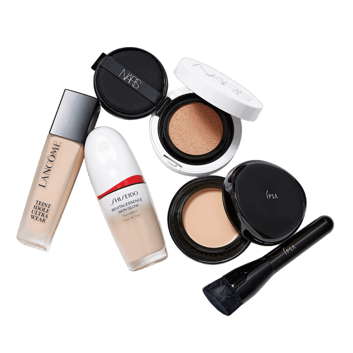 右から:ファウンデイション アルティメイトe SPF25・PA++ 全6色 16g ¥10,450、ブラシ¥2,750(共にイプサ)、NARS ライトリフレクティング セラムクッションファンデーション SPF42・PA++ 全8色 ※写真は神崎さん愛用色03789 SEOUL 11g レフィル¥5,940、ケース¥2,640(NARS JAPAN)、エッセンス スキングロウ ファンデーション SPF30・PA+++ 全12色 30mL ¥7,590(SHISEIDO )、LANCÔMEタンイドル ウルトラ ウェア リキッド N SPF48・PA++ 全14色 ※写真は神崎さん愛用色P-00 30mL ¥7,920(ランコム)