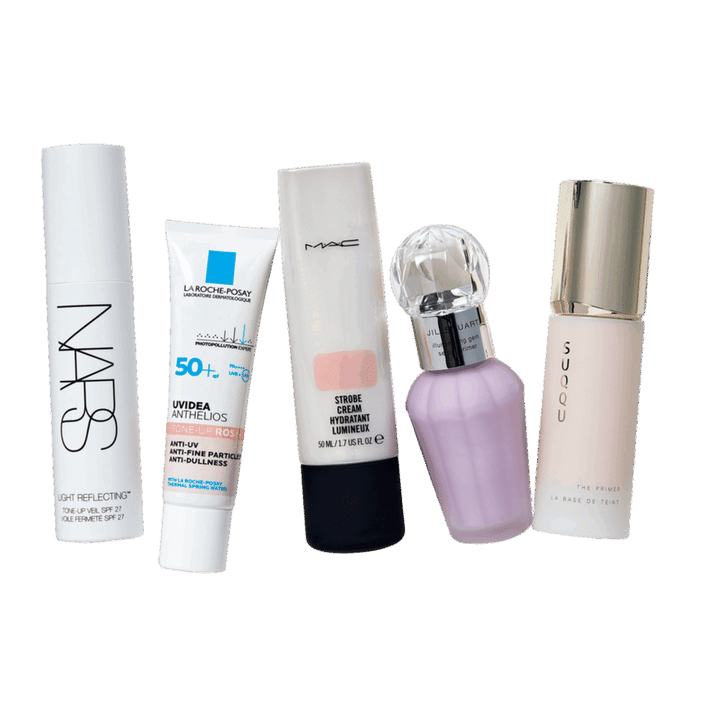 右から:ザ プライマー SPF15・PA + 30g ¥11,000(SUQQU) 、イルミネイティングジェム セラムプライマー SPF40・PA+++ 01 ラベンダージェム 30mL ¥3,850(ジルスチュアート ビューティ)、 ストロボクリーム ピンクライト 50mL ¥6,050(M・A・C) ※3月7日から順次パッケージリニューアル、UVイデア XL プロテクショントーンアップローズ+ SPF50+・PA++++ 30mL ¥3,960(ラ ロッシュ ポゼ)、 NARS ライトリフレクティング トーンアップヴェール SPF27・PA++ 30mL ¥6,490(NARS JAPAN)
