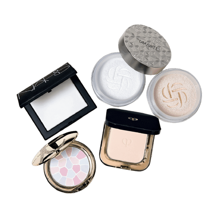 右から:ルース パウダー 00 translusent、07 nude matte snow 各20g 各¥6,050(共にコスメデコルテ)、プードルコンパクトエサンシエルn 5g ¥12,100(クレ・ド・ポー ボーテ)、NARS ライトリフレクティングセッティングパウダー プレスト N 5894 CRYSTAL 1 0 g ¥ 6,160(NARS JAPAN)、ラ プードル オートニュアンス Ⅷ 8.8g ¥11,000(エレガンス コスメティックス)