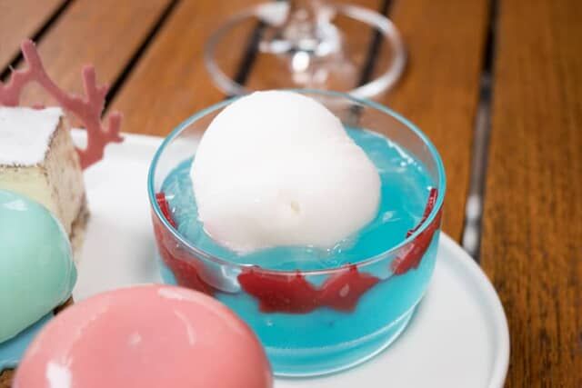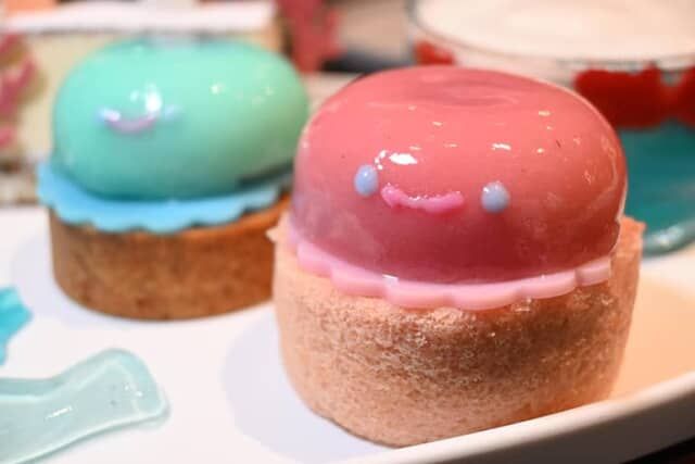 ピンクとブルーのクラゲは、水族館で売っている「クラゲクッション」がモチーフ。ピンククラゲはビーツを使ってピンク色に焼き上げたロールケーキに牛乳寒天を乗せ、シロクラゲが入ったイチゴのジュレを、イチゴのムースで包みます。水色クラゲは、アーモンドクリームとブルーベリーを使ったタルトの上に、ヨーグルトムースとブルーベリーのジュレでできたクラゲをトッピング。味の違いを楽しめます。